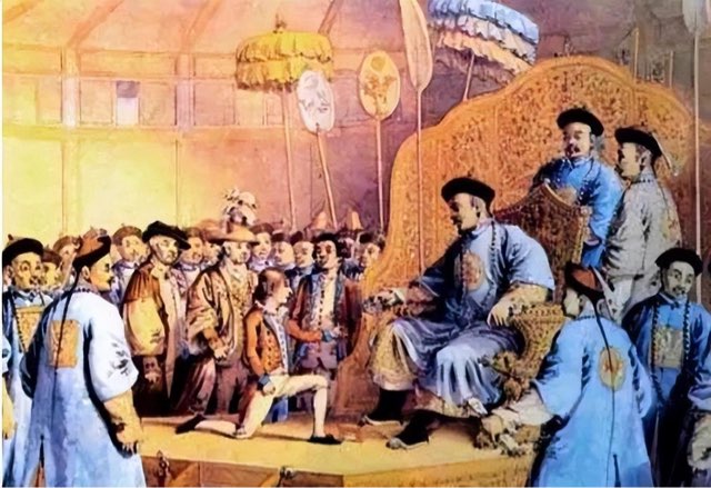 于是英国国王乔治三世精心筹备,派遣马戛尔尼使团访华,不仅带来了诸多工业革命的先进成果,还表达了希望中国开放更多口岸、降低关税、给予租界,并派公使常驻中国等诉求。面对英国使团的到来,乾隆皇帝及清朝官员们却表现出了一种盲目的自大。
