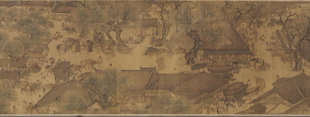 北宋张择端的《清明上河图》以精致的工笔记录了北宋末宋徽宗时代首都汴京(今开封市)郊区和城内汴河两岸的建筑和民生。该图描绘了清明时节,北宋京城汴梁以及汴河两岸的繁华景象和自然风光。作品以长卷形式,采用散点透视的构图法,将繁杂的景物纳入统一而富于变化的画面中,画中人物500多,衣着不同,神情各异,其间穿插各种活动,注重戏剧性,构图疏密有致,注重节奏感和韵律的变化,笔墨章法都很巧妙。全图分为三个段落。