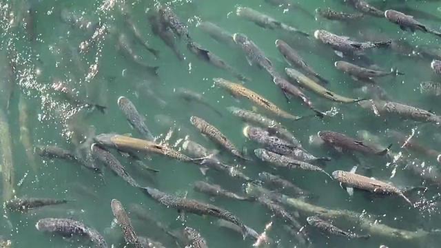 航拍画面里,这些大鳡鱼都看起来体型惊人,部分可能接近两米,体重超过百斤,在水中时隐时现——画面里尖头的是鳡鱼,圆头的鱼是鲢鳙,可以看到数量几乎相当。