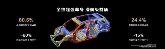 问界新M7安全性能重磅升级,业界最强材料+业界最强主动安全赋予产品更高更强的安全系数。问界新M7采用笼式车身结构设计,全车潜艇级热成型钢占比24.4%,每平方厘米可承受17吨重压。全车高强钢和铝合金占比80.6%,前端三层的碰撞力传导结构设计,拉满被动安全性能。