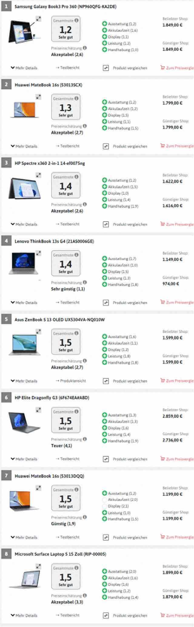 获评 “优秀” 的8款笔记本电脑中,三星 Galaxy Book3 Pro 360 领榜,紧随其后的是华为 MateBook 16s (53013SCX) 和惠普 Spectre x360 2-in-1 14-ef0075ng。此外,令中国工程师自豪的是,华为和联想各有一款,即位列第7的 MateBook 16s (53013DQQ) 和位列第4的 ThinkBook 13s G4,以 1000 欧元左右的价格,比位列第 8 的微软 Surface Laptop 5 15 Zoll 便宜约一半,比最贵的第6名(惠普 Elite Dragonfly G3)便宜约 2/3。