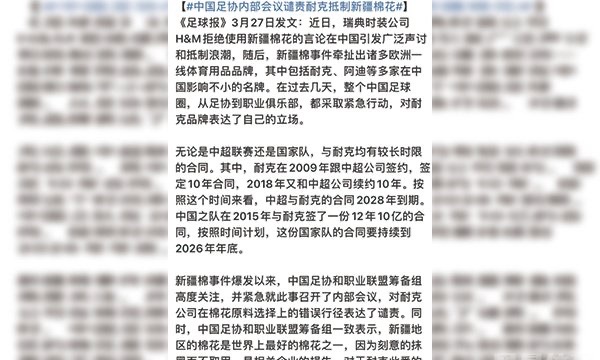 据报道,在新疆棉事件持续发酵的情况下,过去几天整个中国足球圈无论是足协还是各支俱乐部都采取了紧急的措施,并且对耐克品牌表达了十分强硬的态度。目前中超联赛以及中国国家队都和耐克有很长期限的合同,虽然双方在此之前已经建立了长时间的合作关系,但是一旦触及到了国家尊严,就没有任何商量的余地了。