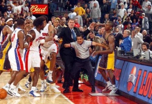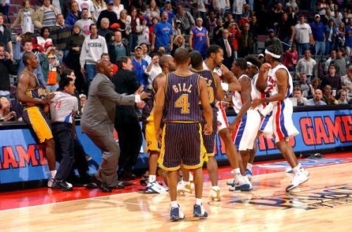 由于双方在场上都太过强硬,比赛的火药味也越来越浓,甚至连裁判的吹罚尺度也开始飘忽不定,于是,在比赛的最后45秒里,一场NBA史上最大规模的斗殴事件开始爆发。【粉丝网】