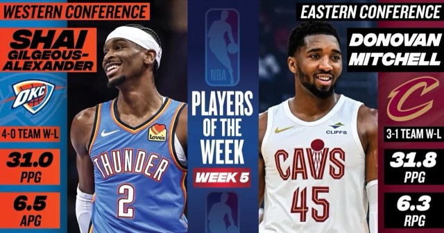 11月25日讯 据悉,NBA官方在今日通过社交媒体公布了2025-26赛季常规赛第五周东西部分区周最佳球员,其中来自于克利夫兰骑士的多诺万·米切尔和俄克拉荷马雷霆的谢伊·吉尔杰斯-亚历山大分别当选。目前,骑士排名在东部分区第四的位置,战绩为12胜7负而雷霆则是排名在西部分区第一。